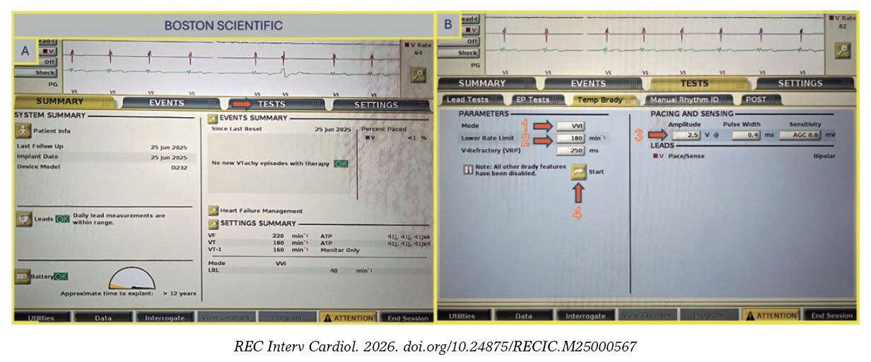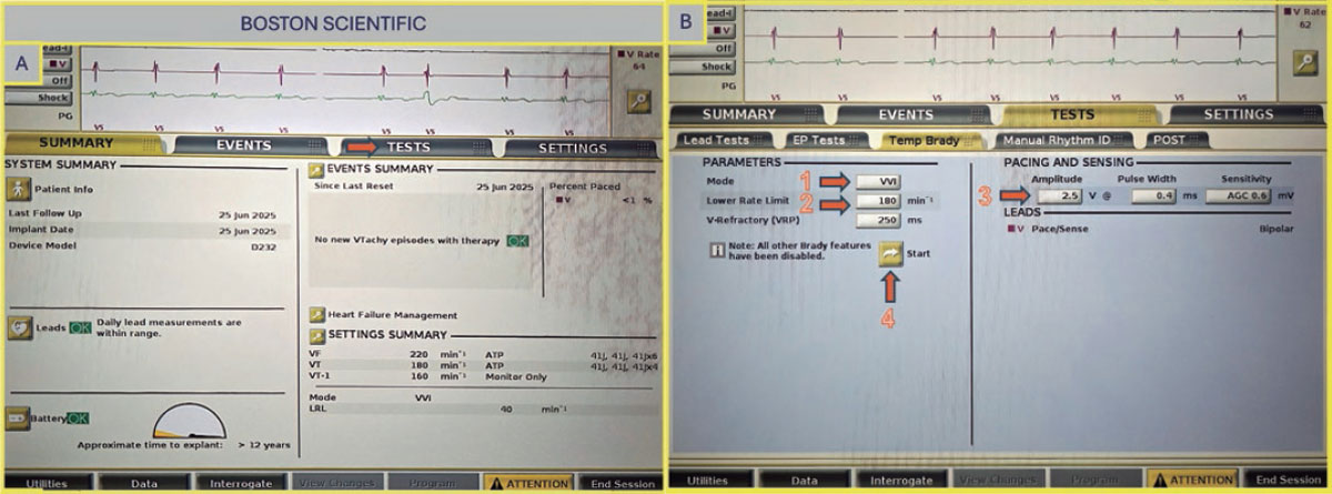 Figura 5. A: pantalla principal de la consola Boston Scientific. Elija “Test” (flecha) para configurar la estimulación. B: elija el modo VVI (flecha 1), fije el límite inferior de frecuencia (flecha 2) y la amplitud (flecha 3) y pulse el botón “Start” para dar comienzo a la estimulación (flecha 4).