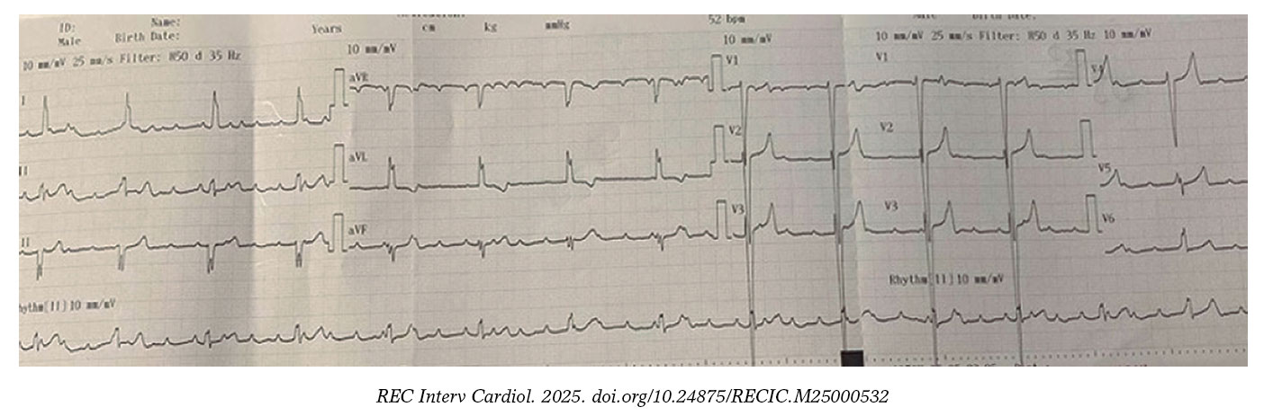 Tras la primera semana de seguimiento posoperatorio, el ECG del paciente mostró un ritmo sinusal normal sin evidencia de BRI.