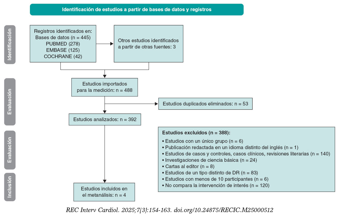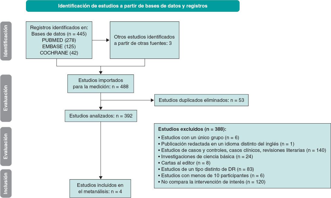 Se identificó un total de 448 estudios mediante búsquedas en bases de datos. Se analizaron 392 estudios tras eliminar los duplicados, de los cuales 388 fueron excluidos por tratarse de estudios con un único grupo (n = 6), publicaciones redactadas en un idioma distinto al inglés (n = 1), estudios de casos y controles, casos clínicos y revisiones de la literatura (n = 140), investigaciones científicas básicas (n = 24), cartas al editor (n = 8), estudios de un tipo distinto de DN (n = 83), estudios con ≤ 10 participantes (n = 6) y estudios que no realizaban comparativas con la intervención de interés (n = 120). Por último, 4 estudios cumplieron con todos los criterios de inclusión y fueron aptos para ser analizados. Al final, se analizaron 642 pacientes de los 4 artículos seleccionados al cumplir todos los criterios de inclusión. El diagrama de flujo PRISMA del proceso de selección de estudios se ilustra en la figura 1.