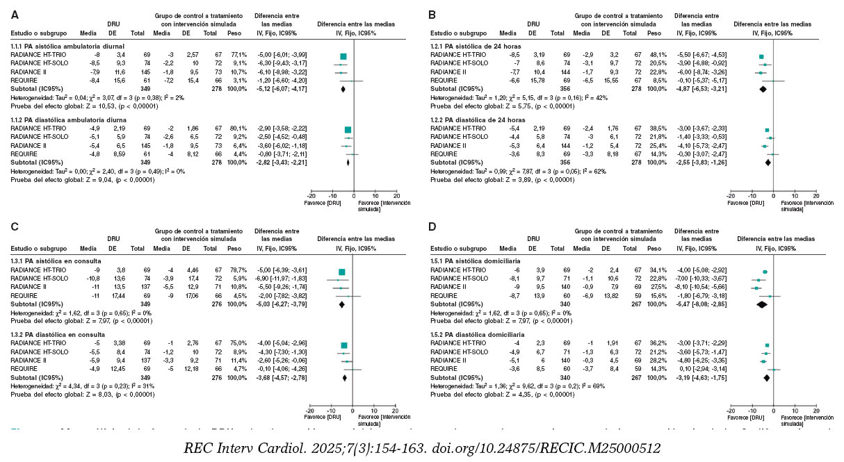 Este metanálisis demuestra que el tratamiento con DRU reduce, de manera efectiva, tanto la PAS como la PAD en diferentes contextos, incluidas la PA de 24 h, ambulatoria, domiciliaria y en consulta durante los primeros 2 meses de seguimiento en pacientes hipertensos (figura 4). Además, la DRU redujo la necesidad de fármacos antihipertensivos 6 meses después de la intervención. No obstante, se debe seguir investigando para valorar sus efectos a largo plazo e identificar a los grupos de pacientes que más se beneficien de esta intervención.