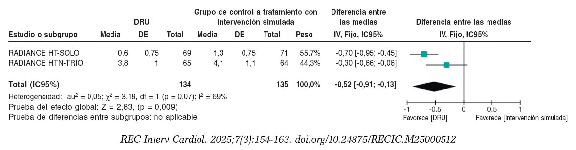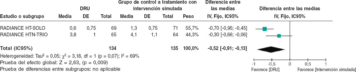 El uso de fármacos 6 meses después de la DRU solo se informó en los ensayos clínicos RADIANCE-HTN SOLO y RADIANCE-HTN TRIO. El análisis de datos reveló que la DRU redujo el número de fárma- cos antihipertensivos en −0,52 (IC95%, −0,91 a −0,13; p = 0,009; I2 = 69%) frente al grupo de control tratado con la intervención simulada (figura 3).