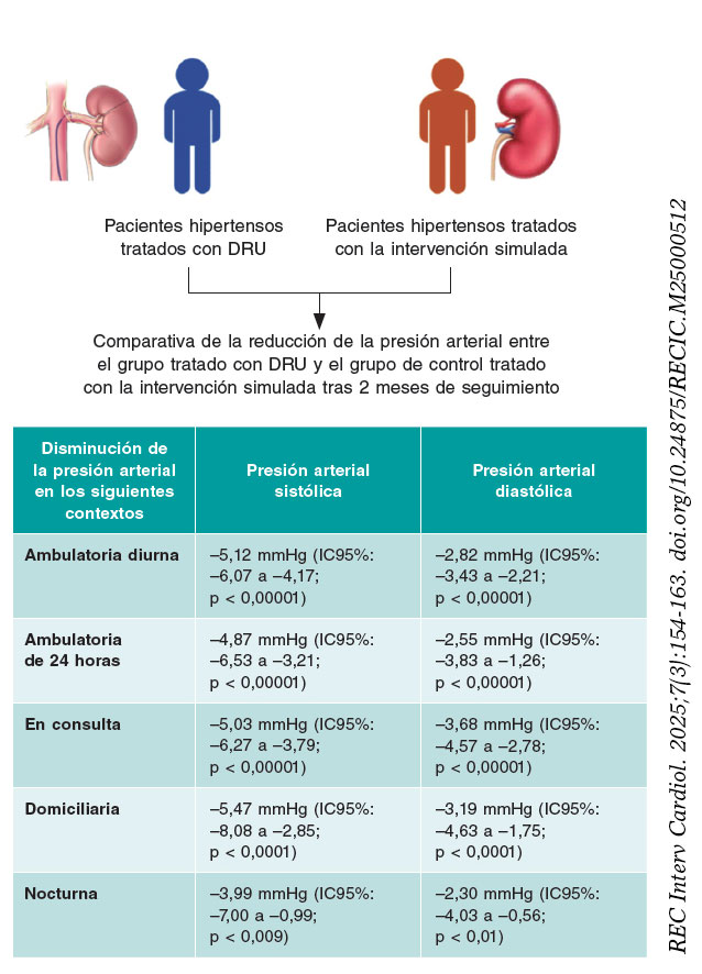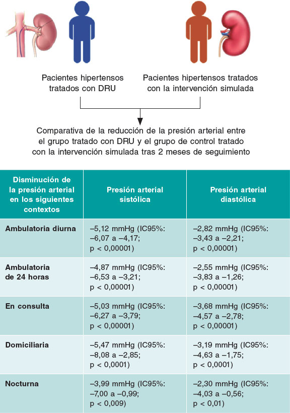 Figura 4. Figura central. Resumen del efecto en la reducción de la presión arterial sistólica y diastólica en pacientes tratados con DRU frente a otros tratados con la intervención simulada tras 2 meses de seguimiento posoperatorio. DRU: denervación renal por ultrasonido.