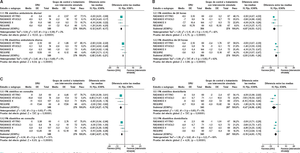 Resultados: En el análisis final se incluyeron cuatro estudios con 642 pacientes. La DRU redujo de manera significativa la presión arterial sistólica (PAS) ambulatoria diurna (−5,12 mmHg; IC95%, −6,07 a −4,16; p ≤ 0,00001), la PAS de 24 h (−4,87 mmHg; IC95%, −6,53 a −3,21; p ≤ 0,00001) y la PAS en la consulta (−5,03 mmHg; IC95%, −6,27 a −3,79; p ≤ 0,00001), y logró una disminución de la medicación de los pacientes a los 6 meses del procedimiento.