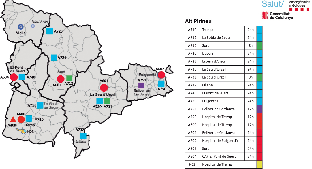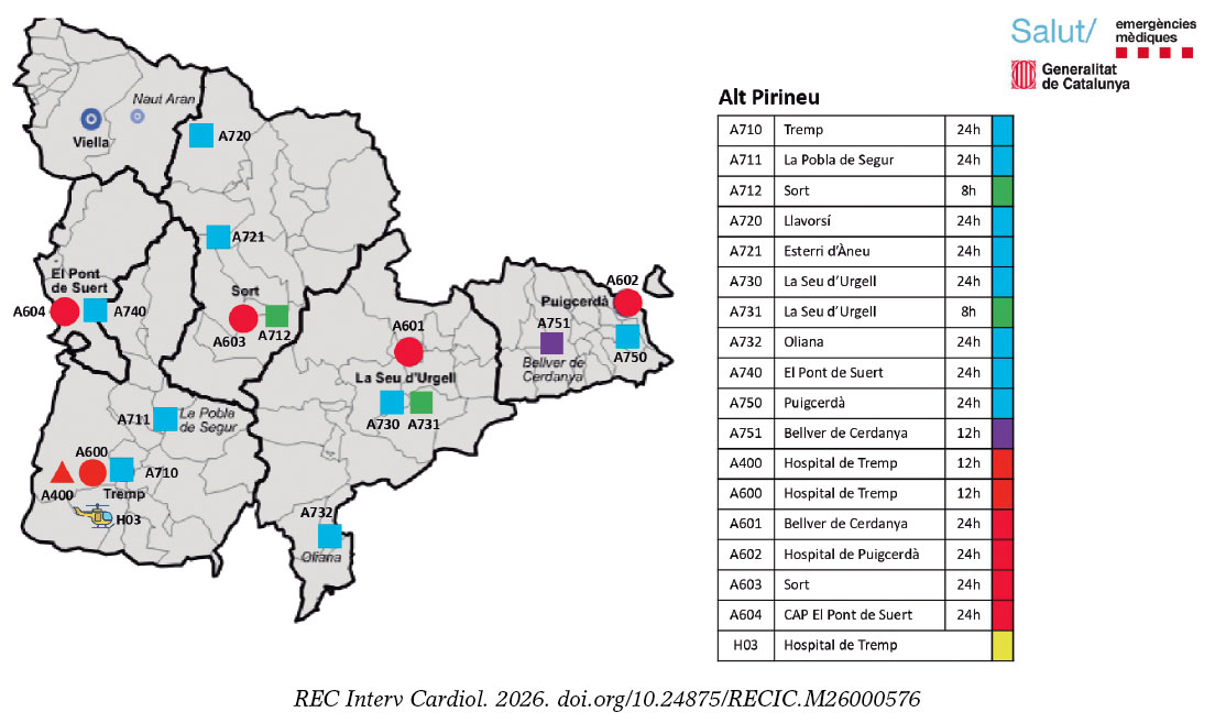El sistema sanitario de la región se enfrenta a diferentes retos. La atención prehospitalaria está a cargo del SEM, servicio público que cubre todo el territorio las 24 horas del día y dispone de una unidad de soporte vital avanzado en cada comarca y un helicóptero medicalizado de los 4 que operan en Catalunya. El Alt Pirineu-Aran tiene 4 hospitales comarcales, sin servicio de hemodinámica (figura 1).