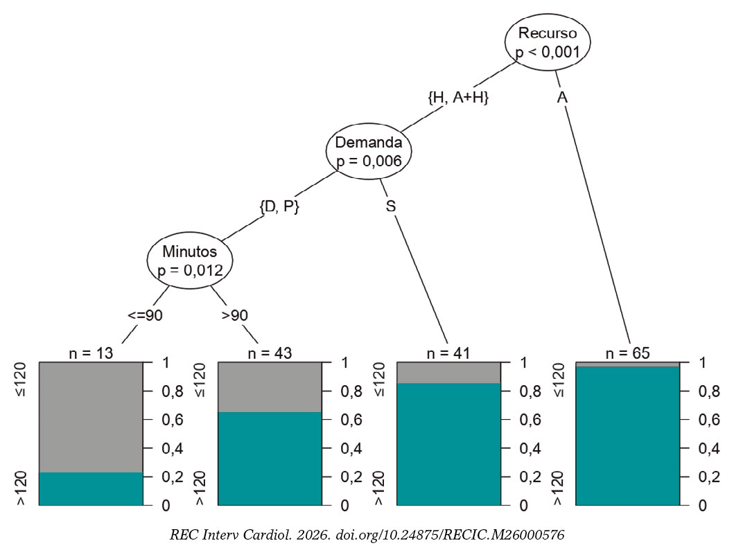 Se analizaron 4 variables de resultado binarias: uso de fibrinolisis como tratamiento inicial, retrasos en la fibrinolisis (> 10 minutos desde el ECG), retrasos en la ICPp (> 120 minutos desde el ECG) y mortalidad. Las asociaciones entre cada una de las variables de resultado y las características del paciente y de la asistencia se evaluaron utilizando la prueba de χ2 de Pearson para variables cualitativas (o la prueba exacta de Fisher en caso de frecuencias esperadas menores de 5), la prueba U de Mann-Whitney para variables cuantitativas de distribución no normal y la prueba t de Student en caso contrario. La importancia de las variables para el retraso en cada tratamiento y para la mortalidad se analizó aplicando el algoritmo de Boruta para la selección de las variables. Solo se seleccionaron para un análisis multivariable adicional aquellas que no fueron rechazadas por dicho algoritmo, con el fin de evitar el sobreajuste de las estimaciones a los datos. Se utilizó un árbol de clasificación de inferencia condicional aplicando la prueba de Monte Carlo y limitando la frecuencia de los nodos terminales a un mínimo de 3.