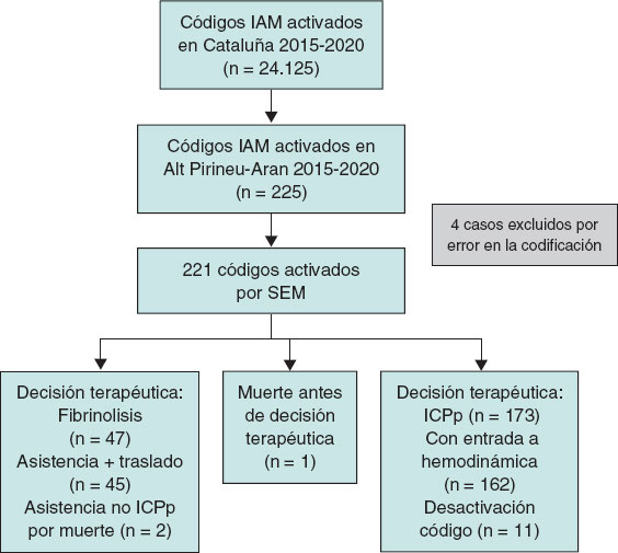 Durante el periodo de estudio, en Cataluña se activaron 24.125 códigos IAM. El estudio analizó 225 casos ocurridos en Alt Pirineu-Aran, lo que supone menos del 1% del total. Se excluyeron 4 pacientes por no cumplir criterios de código (1 tromboembolia pulmonar, 2 errores de codificación y 1 duplicado) (figura 2).