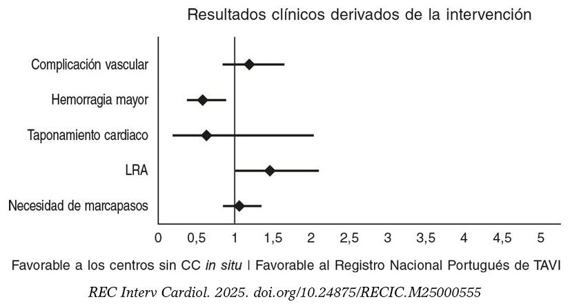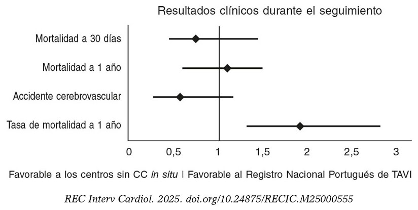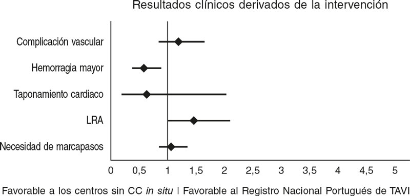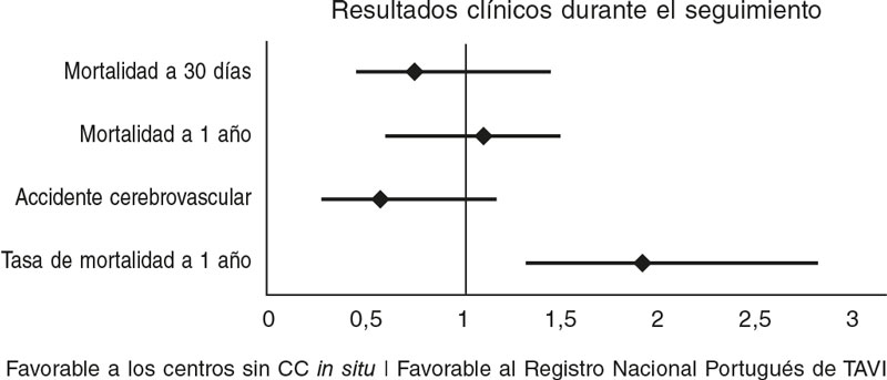 Figura 2. Diagrama de bosque de los resultados clínicos de la intervención que compara nuestro centro sin CC in situ con el registro nacional portugués de TAVI16 (centros con CC in situ).