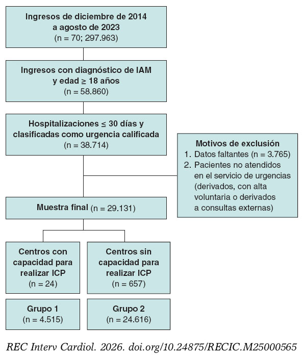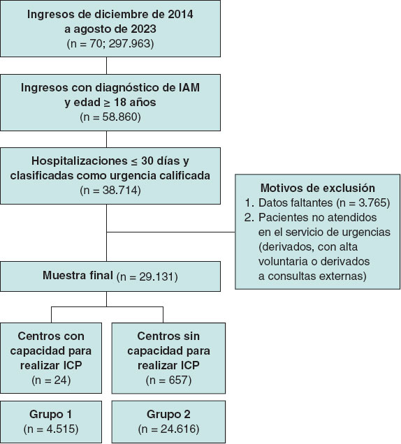 Figura 1. Diagrama de flujo del proceso de filtrado. Se incluyeron pacientes con IAM (CIE-10 I21.0-I21.9), edad ≥ 18 años, hospitalizados ≤ 30 días en servicios de urgencias de la Secretaría de Salud (SSA). Se excluyeron todos aquellos casos con datos incompletos o no atendidos en urgencias. La cohorte final se clasificó en centros con y sin capacidad para realizar ICP identificados mediante registros de intervención coronaria percutánea o cateterismo cardiaco. IAM: infarto agudo de miocardio; ICP: intervención coronaria percutánea.