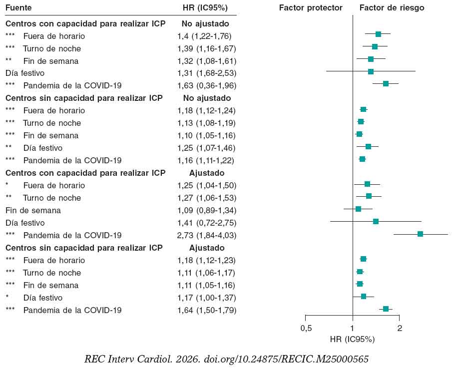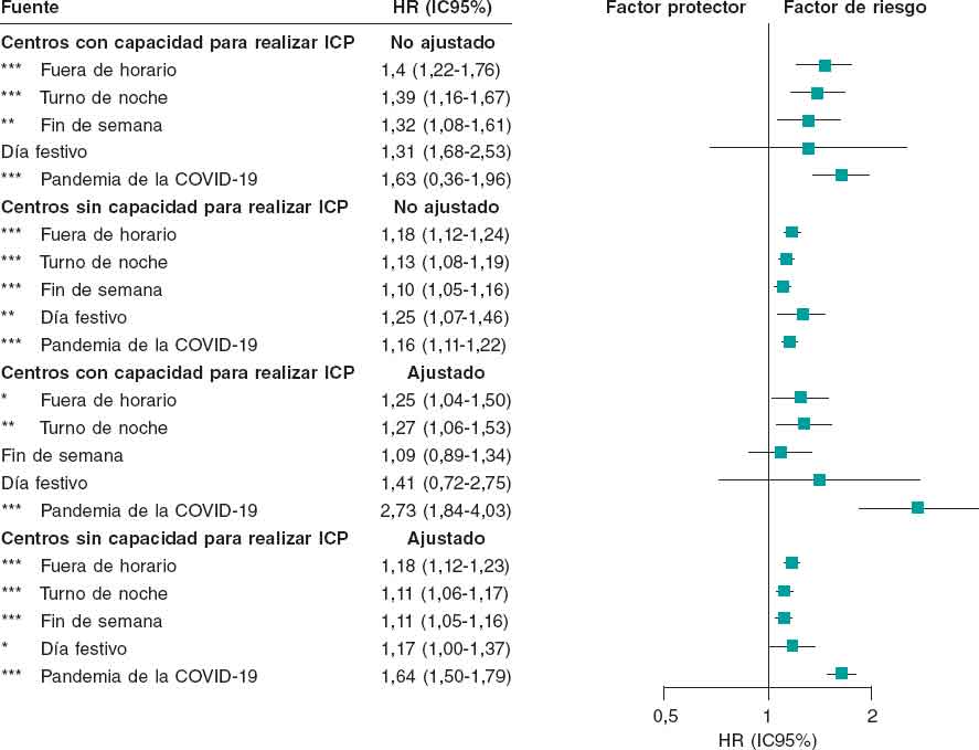 Figura 2. Riesgo de mortalidad asociado a ingresos fuera del horario laboral por IAM: análisis estratificado por tipo de hospital (centros con y sin capacidad para realizar ICP). El gráfico muestra los resultados de los modelos de regresión de Cox ajustados y no ajustados. Los ajustes incluyeron edad, sexo, tipo de urgencia, tipo de cama, región, año de ingreso, tipo de IAM y periodo de COVID-19. Para los centros con capacidad para realizar ICP, se llevaron a cabo ajustes adicionales por disponibilidad de la sala de hemodinámica por turno, tipo de angiografía y número de especialistas por turno. Los puntos representan los HR de mortalidad con líneas horizontales para un IC95%. Los resultados se muestran por separado para centros con y sin capacidad para realizar ICP. HR > 1 indica un mayor riesgo de mortalidad; HR < 1 indica un menor riesgo. *p < 0,05; ** p < 0,01; ***p < 0,001. COVID-19, enfermedad por coronavirus 2019; HR: hazard ratio; IC95%: intervalo de confianza del 95%; ICP: intervención coronaria percutánea.