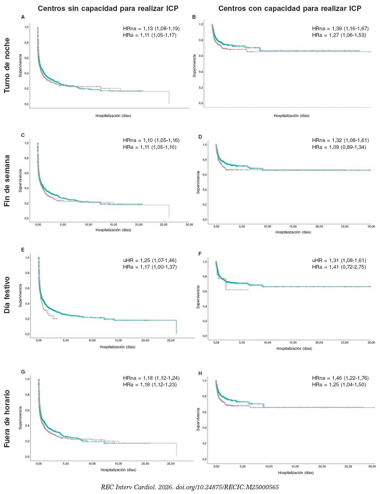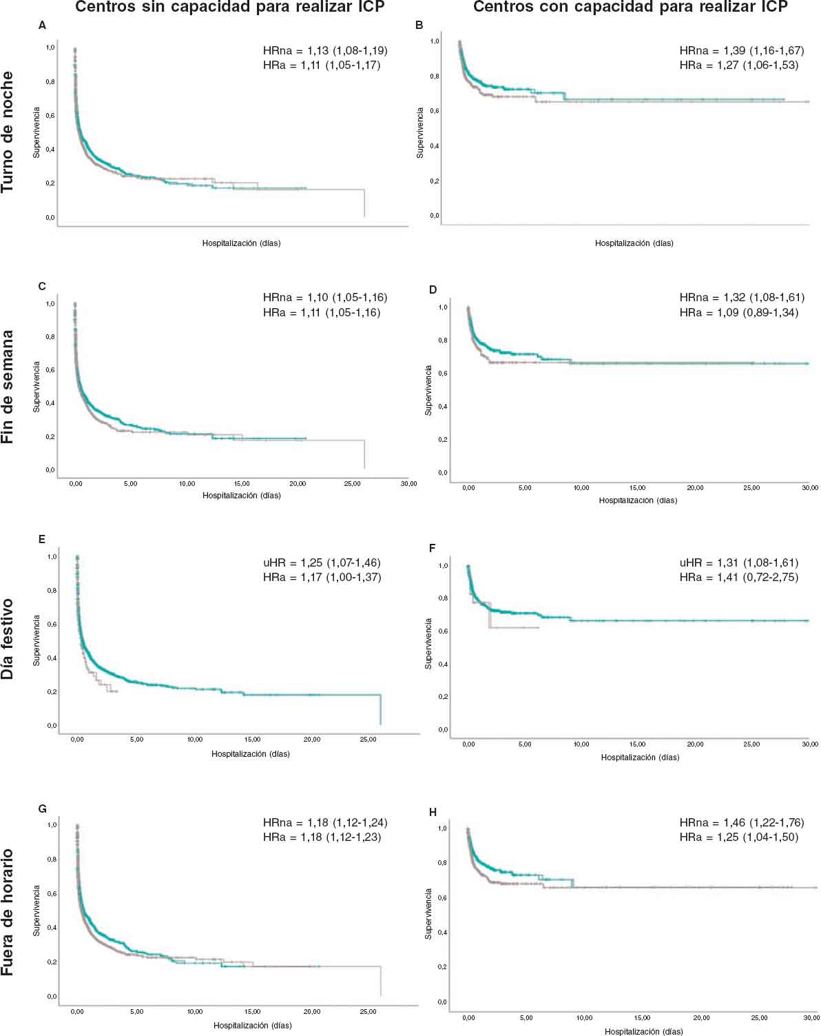 Figura 3. Análisis de Kaplan–Meier de la mortalidad por IAM fuera del horario laboral según tipo de hospital. Cada columna representa la disponibilidad de la SH y cada fila los componentes del ingreso fuera del horario laboral. Cada panel (A-H) muestra el riesgo de mortalidad ajustado (HRa) y no ajustado (HRna) con sus correspondientes intervalos de confianza del 95%.