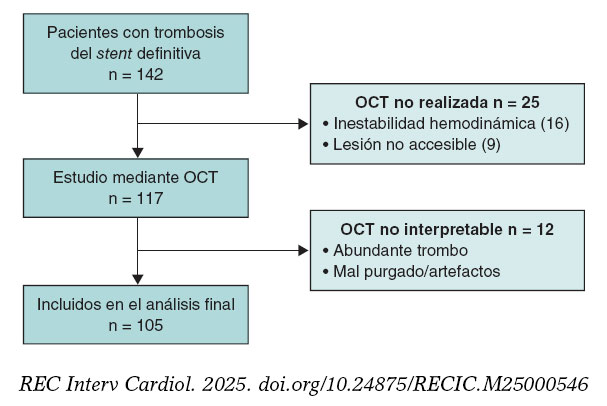Se realizó un registro prospectivo unicéntrico en el que se incluyeron consecutivamente pacientes con diagnóstico de TS definitiva, según los criterios del Academic Research Consortium, desde octubre de 2013 hasta diciembre de 2022, en el Hospital Universitario de La Princesa, Madrid. Durante ese periodo se implantaron stents en 6.881 pacientes. Se excluyeron los pacientes con inestabilidad hemodinámica grave y lesiones inaccesibles con el catéter de OCT.