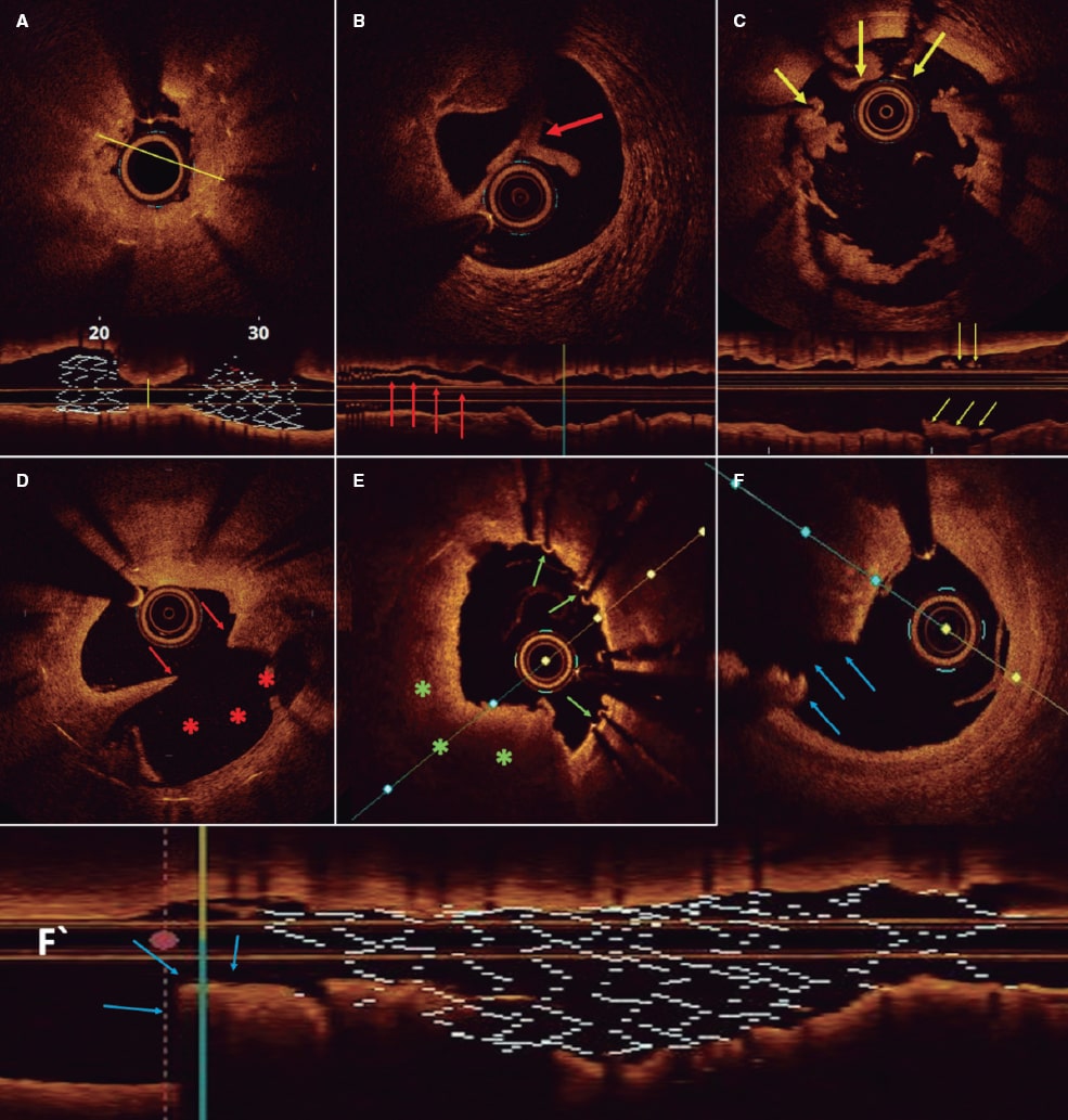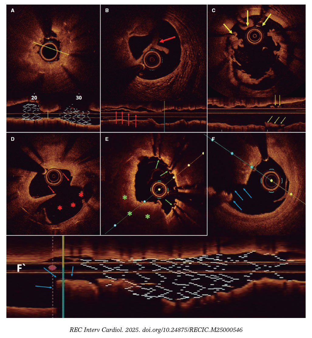 Figura 4. Imágenes representativas de los hallazgos dominantes por tomografía de coherencia óptica. A: corte longitudinal y seccional de un stent con infraexpansión marcada (la línea indica el diámetro mínimo). B: disección del borde del stent. La flecha indica el borde de tejido separado del resto de la pared. C: mala aposición. Las flechas señalan struts, asociados a trombo, que no están en contacto con la pared del vaso. D: neoateroesclerosis con placa rota. Las flechas indican la solución de continuidad de la íntima, y los asteriscos la cavidad en la placa vaciada de su contenido. E: struts no recubiertos (flechas). F y F‘: cortes seccional y longitudinal de stent con enfermedad del borde distal con placa rota (flechas).