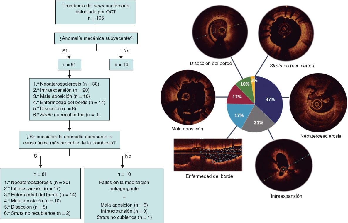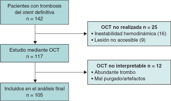 Resultados: Se incluyeron 105 pacientes. Se identificaron anomalías mecánicas por OCT en el 87% de los casos, y finalmente se establecieron como causa más probable de la TS en el 77,1%. Los hallazgos difirieron de manera significativa en función de la temporalidad de las TS: en las agudas, lo más frecuente fue no encontrar ninguna anomalía mecánica (41,8%); en las subagudas, predominó la infraexpansión del stent (47,8%); en las tardías, la mala aposición (30,8%), y en las muy tardías, la neoateroesclerosis (52%). En cambio, no se encontraron diferencias en los hallazgos de OCT en función del tipo de stent trombosado. En todos los casos se realizó un tratamiento dirigido a corregir la anomalía detectada, con implante de nuevo stent en el 52% de los pacientes. No se detectaron complicaciones relacionadas con la técnica de OCT.