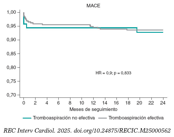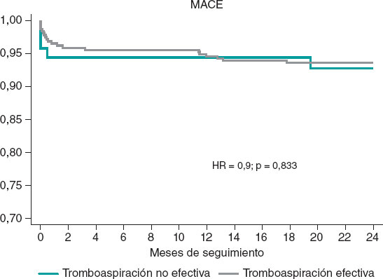 La presencia de una carga trombótica elevada es un determinante para lograr una TM efectiva, y también parece relacionarse con mejores resultados clínicos. En nuestra serie, la TM efectiva se consiguió en el 82% de los casos, pero no se correlacionó significativamente con el éxito del procedimiento final (97% frente a 95%; p = 0,67) por el pequeño tamaño muestral de los 2 grupos. La efectividad de la TM fue mayor en los vasos con alta carga trombótica (TIMI ≥ 4; p < 0,001), en concordancia con un metanálisis que demostró una reducción en la mortalidad por causa cardiovascular en los pacientes con IAMCEST e ICPp en el subgrupo con alta carga trombótica tratados con TM en comparación con ICPp sola (2,5% frente a 3,2%; hazard ratio [HR] = 0,81; IC95%, 0,65-0,98; p = 0,03)15. Estos datos refuerzan la opinión de que una correcta selección de los candidatos a TM es crucial para obtener beneficio con el tratamiento. Sin embargo, dicho metanálisis también halló un aumento en el riesgo de accidente cerebrovascular (0,9% frente a 0,5% en el grupo de ICPp sola)15, complicación que podría estar relacionada con la técnica de TM realizada.