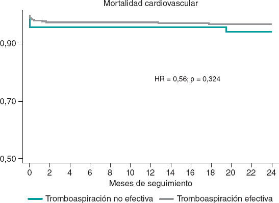 Los resultados clínicos a corto y largo plazo en los pacientes con IAMCEST que requirieron TM son buenos, con una baja mortalidad por causa cardiovascular a 1 año, del 3,5%, comparable a la observada en estudios aleatorizados. En el estudio TASTE7, la mortalidad a 30 días fue del 2,4% en el grupo de TM y del 2,9% en el grupo con ICPp sola (HR = 0,84; IC95%, 0,70-1,01; p = 0,06). En el estudio TAPAS20, en el grupo de TM la mortalidad por todas las causas a 30 días fue del 2,1% (4,0% en el grupo de ICPp convencional), alcanzando la significación estadística (p = 0,07) al año de seguimiento. En registros extensos se observa una mortalidad equivalente a la de nuestra serie, con un 2,8% frente a un 3,0% en el registro sueco21 y también en el registro japonés22. La mortalidad observada en un metanálisis con datos agregados realizado con los estudios de TM publicados fue del 3,7%15; seleccionando los pacientes con alta carga trombótica (TIMI ≥ 3 en el subgrupo del metanálisis) se observó una mortalidad por causa cardiovascular del 2,5% (170 de 6.872 pacientes) en el grupo de TM frente al 3,1% (205 de 6.599 pacientes) en el grupo de ICPp sola (HR = 0,8; IC95%, 0,65-0,98; p = 0,03)15. Seleccionar correctamente este subgrupo de pacientes con elevada carga trombótica es primordial para el mayor beneficio del tratamiento.
