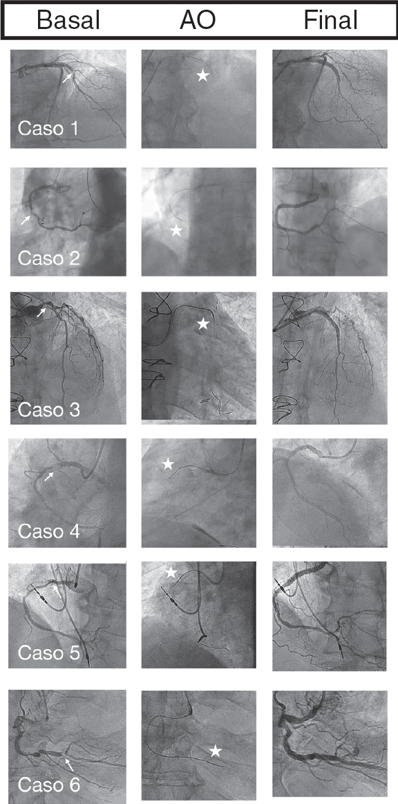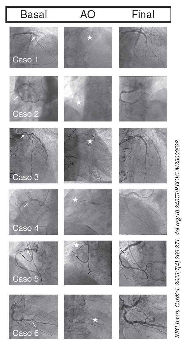 En todos nuestros casos tuvo éxito la AO, con cruce de la corona a través de la lesión que permitió posteriormente la angioplastia sin complicaciones mayores. En la figura 1 se ofrece un resumen con las imágenes angiográficas de cada caso.