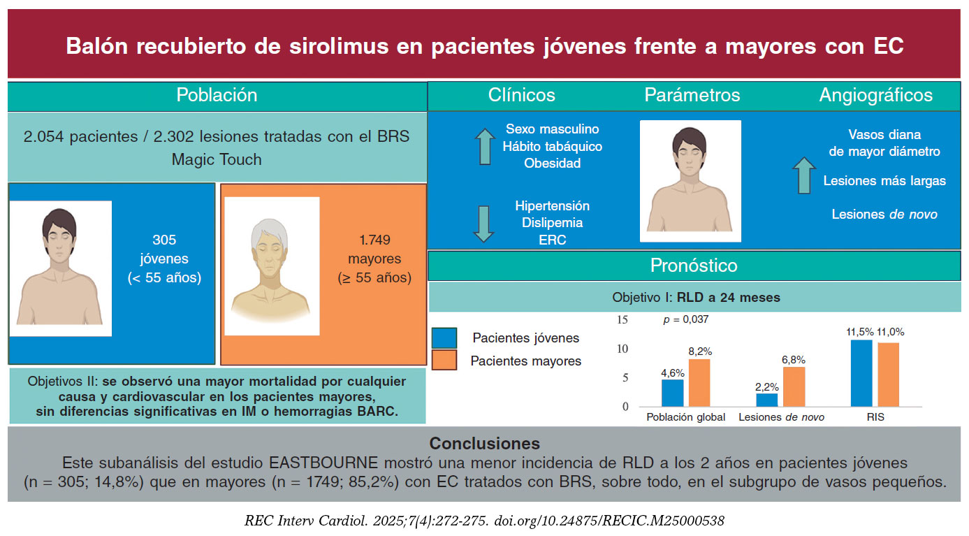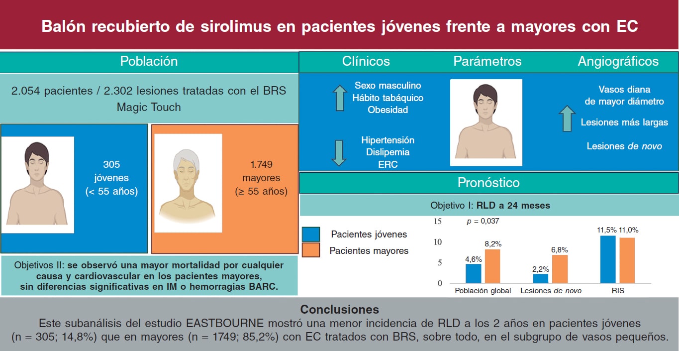 Este subanálisis del EASTBOURNE evaluó el rendimiento clínico del BRS MagicTouch en base a la edad de los pacientes (< 55 y ≥ 55 años). Los pacientes jóvenes tenían un perfil de riesgo clínico distinto, incidencias más altas de tabaquismo y obesidad y una incidencia más baja de otros factores de riesgo cardiovascular. Además, las lesiones coronarias de los pacientes < 55 años fueron más largas y con compromiso de vasos más pequeños, con una distribución y complejidad similares a las del otro grupo. Se debe mencionar que los pacientes < 55 años tuvieron un mejor pronóstico que aquellos ≥ 55 años y, casi, la mitad del riesgo de RLD a los 2 años. Esta diferencia se advirtió especialmente en la cohorte con EC de pequeño vaso, donde los jóvenes tenían un riesgo 3 veces menor de RLD y 7 veces menor de IM que los pacientes mayores.