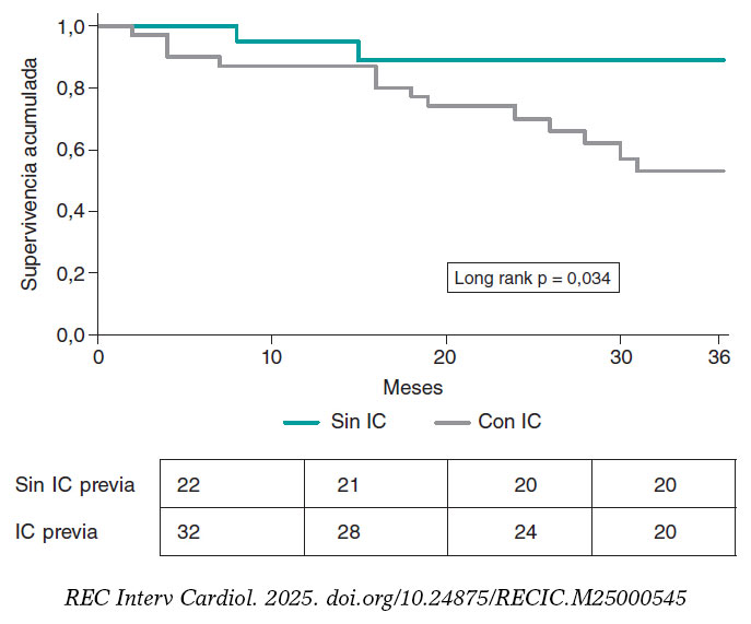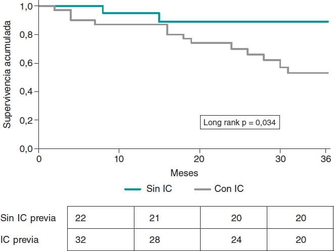 Figura 1. Curva de Kaplan-Meier para el evento de descompensación de la insuficiencia cardiaca (IC) durante el seguimiento, según la presencia de IC previa.