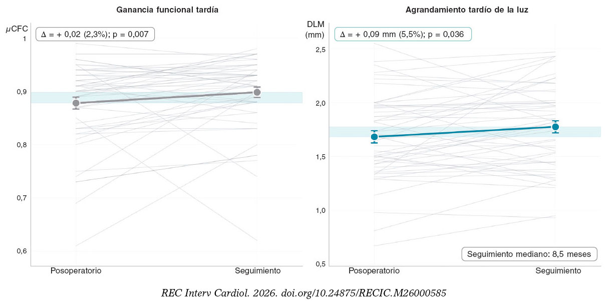 La angioplastia con balón farmacoactivo (BFA) se ha asociado al agrandamiento tardío de la luz (ATL), un fenómeno que provoca que las dimensiones del vaso aumenten con el paso del tiempo en ausencia de un armazón permanente1. Aunque esta observación angiográfica está bien documentada, la evolución temporal de la fisiología coronaria tras el tratamiento con BFA no está caracterizada del todo. Estudios publicados revelan que la reserva fraccional de flujo mejora desde los valores basales hasta el posoperatorio y se mantiene estable durante el seguimiento2,3; no obstante, la mejoría funcional evaluada de forma pareada desde el posoperatorio hasta el seguimiento no se ha documentado específicamente. Por eso, se realizó una evaluación temporal de forma pareada de la ganancia funcional tardía (GFT), definida como la mejoría fisiológica progresiva que ocurre tras la finalización la intervención inicial, en pacientes sometidos a angioplastia con BFA por lesiones coronarias de novo.