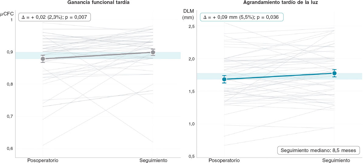 Figura 1. Análisis pareado del diámetro luminal mínimo y cociente de flujo cuantitativo basado en la ley de Murray desde el posoperatorio hasta el seguimiento (n = 66 lesiones pareadas). Las trayectorias de cada paciente se muestran en líneas grises y los valores medios en barras de error estándar en gris (GFT, izquierda) y verde (ATL, derecha). Se muestran los cambios absolutos y relativos. ATL: agrandamiento tardío de la luz; GFT: ganancia funcional tardía; μCFC: cociente de flujo cuantitativo basado en la ley de Murray.