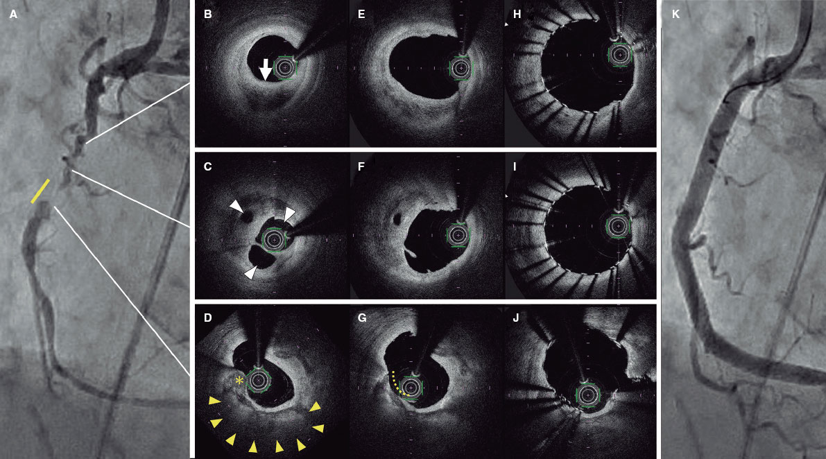 Varón de 80 años en hemodiálisis de mantenimiento que acude por angina de esfuerzo. La coronariografía revela la presencia de una oclusión total con calcificación grave (figura 1A, línea amarilla) de la coronaria derecha. Tras predilatación con un balón de 1,5 mm, la tomografía de coherencia óptica por dominio de frecuencia (OFDI; Terumo, Japón) identificó la presencia de placa estratificada (PE) (figura 1B, flecha), estructuras en panal de abeja (EPA) (figura 1C, puntas de flecha) y un nódulo coronario calcificado (NC) con una lámina gruesa calcificada (figura 1D, asterisco y puntas de flecha). Como la PE y las EPA pueden contener trombos organizados, la aterectomía rotacional (AR) convencional podría desestructurar estas regiones vulnerables, con el consiguiente riesgo de embolización distal y no-reflow. En este sentido, se optó por realizar una aterectomía orbital (AO) selectiva con el sistema Diamondback 360 (Abbott Vascular, Estados Unidos). Se avanzó una corona de 1,25 mm hacia el segmento calcificado distal sin utilizar el modo glide-assist (rotación a bajas revoluciones). La AO se realizó mediante una técnica de pullback controlada centrada, sólo, en la lesión calcificada y no en las estructuras vulnerables adyacentes. Después, se dilató el segmento tratado con un balón de corte de 2,5 mm. La OFDI confirmó la ausencia de daño significativo sobre la PE (figura 1E) o las EPA (figura 1F), con una reducción eficaz del volumen del nódulo calcificado (figura 1G, línea discontinua). No se observó embolización distal ni no-reflow. Se implantaron 2 stents farmacoactivos, seguidos de posdilatación con un balón de alta presión de 3,5 mm. Tanto la OFDI final (figura 1H-J) como la angiografía (figura 1K) confirmaron la excelente expansión del stent. Se obtuvo el consentimiento informado.