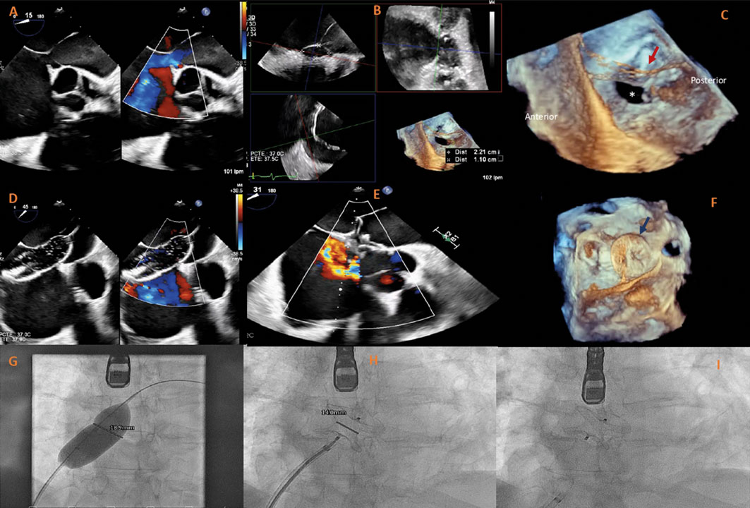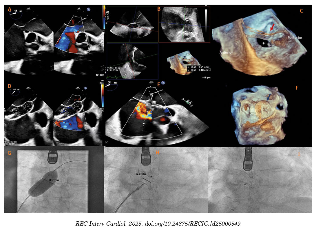 Varón de 67 años con signos de insuficiencia cardiaca derecha secundaria a comunicación interauricular (CIA) con dilatación ventricular derecha, shunt izquierda-derecha significativo (Qp/Qs 1,5) y sin hipertensión pulmonar precapilar significativa (presión arterial pulmonar media, 26 mmHg; resistencia vascular pulmonar, 2 UW). La ecocardiografía transesofágica tridimensional (ETE 3D) reveló la presencia de un cor triatriatum sinister (CTS) con una membrana que se extendía desde el extremo superior y posterior de la fosa oval hasta la cresta pulmonar, con múltiples fenestraciones, la mayor de 24 mm (figura 1A). Se confirmó la presencia de una CIA tipo ostium secundum de 22 × 11 mm, con el borde posterior parcialmente recubierto por la membrana (figura 1B-C). Como el paciente era técnicamente apto y presentaba un riesgo quirúrgico elevado en un contexto de cirrosis, se optó por un abordaje percutáneo. La intervención se realizó bajo guiado simultáneo por ETE 3D y fluoroscopia, la CIA se cruzó con una guía de 0,035 pulgadas y un catéter multipropósito, la medición con balón confirmó la presencia de un defecto de 20 mm y, por último, se implantó con éxito un oclusor septal Amplatzer de 24 mm (Abbott Structural Heart, Estados Unidos) (figura 1D-F). La ETE confirmó la correcta posición del dispositivo, sin shunt residual ni obstrucción del flujo en la aurícula izquierda. Se obtuvo el consentimiento informado del paciente.