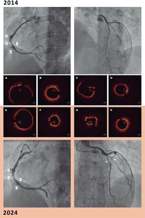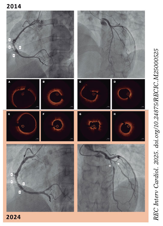 En 2014, un varón de 25 años con antecedentes de síndrome hipereosinofílico fue derivado a nuestro centro tras un hallazgo incidental de calcificación en la coronaria derecha (CD) en la tomografía computarizada. La coronariografía reveló la presencia de lesiones aneurismáticas en la CD (figura 1) y las imágenes de la OCT, la presencia de anomalías mixtas en la pared arterial: un aneurisma calcificado (figura 1A), engrosamiento intimal fibrótico, rotura de la túnica media y vasa vasorum prominentes (figura 1B), calcificación (figura 1C) y un vaso distal menos comprometido (figura 1D). Se optó por un curso diario de 100 mg de ácido acetilsalicílico.