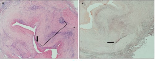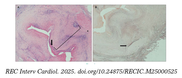 En 2024, se realizó una nueva coronariografía debido a una angina de esfuerzo que confirmó el avance de la enfermedad en la CD y una mayor calcificación en la parte media de la misma, según evidenció la OCT realizada en el mismo segmento arterial. Además, el segmento distal confirmó el avance de la enfermedad con engrosamiento intimal y rotura de la túnica media (figura 1; figuras 1E-H). El hallazgo de una nueva estenosis crítica en la descendente anterior propició que se biopsiara un segmento aneurismático de la arteria temporal (figura 2). Los hallazgos histopatológicos fueron similares a los observados en el OCT de las coronarias. La pared arterial engrosada evidenció la presencia de hiperplasia intimal fibrótica/miofibroblástica, infiltrado inflamatorio agudo, necrosis y cambios fibrinoides (figura 2A, flecha) y una pérdida de la lámina elástica interna (figura 2B, flecha; figura 2A, asterisco) y vasos adventicios, lo cual confirmó la presencia de inflamación crónica perivascular.