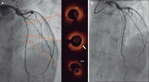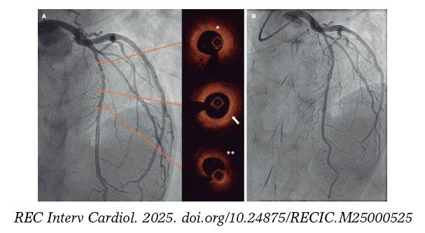 Teniendo en cuenta los síntomas y hallazgos en la descendente anterior (engrosamiento intimal y rotura de la túnica media, sugestivos de vasculitis; figura 3A, asterisco y flecha) y la presencia de un vaso distal sano (figura 3A, doble asterisco), se optó por realizar una intervención coronaria trastorácica con balón farmacoactivo (figura 3B).
