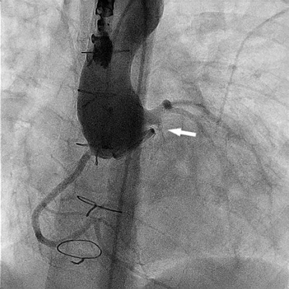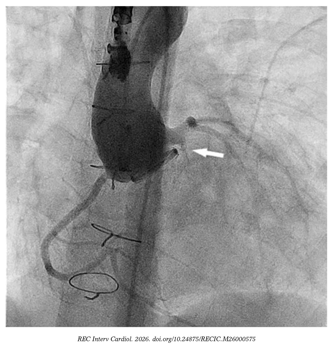 En la aortografía inicial no se detectó la fuga periprotésica, pero sí una dilatación del tronco coronario izquierdo de 6,5 mm y una fístula de este al ventrículo izquierdo de 2,4 mm de diámetro y 4,5 mm de longitud (figura 1 y vídeo S1).