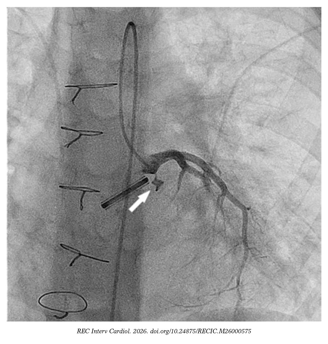 Se sondó la fístula con un catéter NIH 4F modificado (Cordis, Estados Unidos) y una guía hidrófila de 0,035 pulgadas sobre la que se avanzó un catéter de liberación de 4Fr para implantar un dispositivo Nit-Occlud PDA 4 × 4 mm (PFM Medical, Alemania) (figura 2 y vídeo S2). Se eligió este dispositivo en lugar de oclusores de malla de nitinol porque se consideró que la longitud de estos últimos era excesiva y que sus discos de retención podían interferir con la coronaria.