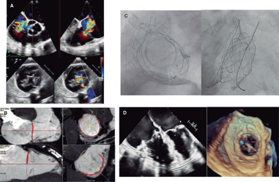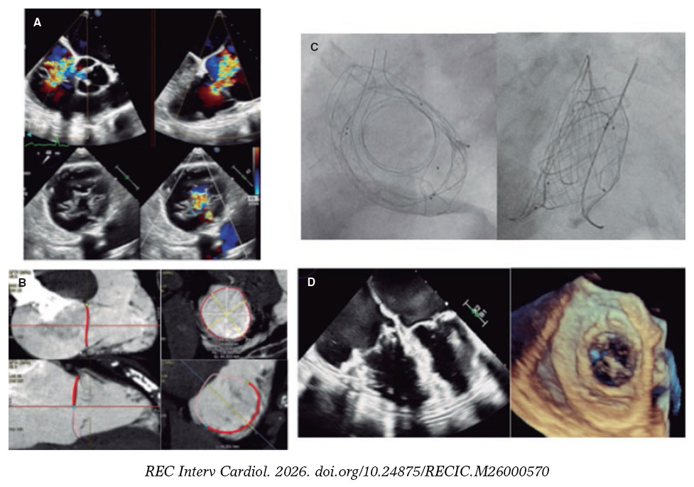 El procedimiento se realizó en una mujer de 81 años (TRI-SCORE 6), sintomática (clase IV de la New York Heart Association, ambulatoria) con insuficiencia tricuspídea masiva funcional (anchura del defecto de 9 mm) y anillo de 137 mm de perímetro (figura 2A-B). Se implantó una prótesis VDyne (tamaño 1 con sobredimensión del 6%) bajo guía fluoroscópica y ecocardiográfica, logrando una resolución completa de la insuficiencia tricuspídea detectada en las imágenes angiográficas, ecocardiográficas y de tomografía computarizada posprocedimiento (figura 2C-D y vídeo S1, vídeo S2, vídeo S3 y vídeo S4). Tras el alta hospitalaria al quinto día, la paciente presentó mejoría de la clase funcional (II), con mayor distancia recorrida en la prueba de la marcha (+90 m). Este caso refuerza el potencial del RVTP con prótesis específicas en pacientes sin alternativas previas.