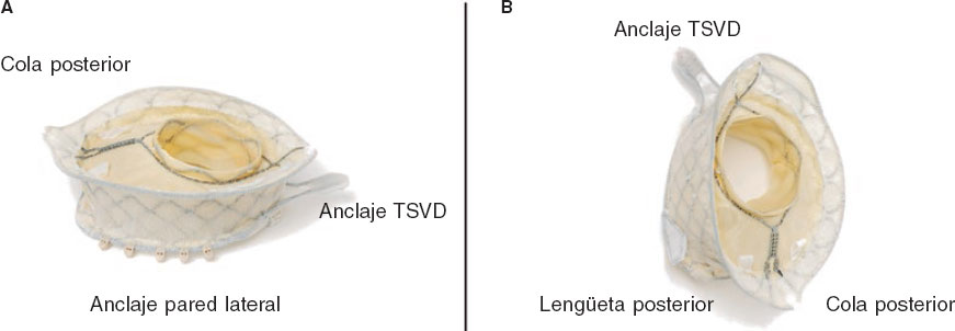El reemplazo de válvula tricúspide percutáneo (RVTP) constituye una alternativa emergente para pacientes de alto riesgo quirúrgico con insuficiencia tricuspídea aislada, grave y sintomática, en especial cuando la anatomía no permite la reparación percutánea. Se presenta el primer caso en España de RVTP con la nueva prótesis percutánea VDyne Valve (VDyne, Estados Unidos), diseñada para preservar la morfología asimétrica del anillo tricuspídeo. La prótesis, de nitinol y doble marco, alberga una válvula porcina trivalva de 30 mm. El marco externo asimétrico se adapta a anillos de 42-56 mm y se fija mediante anclaje en el tracto de salida del ventrículo derecho (TSVD), con pestañas en la pared libre, una lengüeta posteroseptal y una cola ventricular (figura 1). El dispositivo se monta verticalmente en un sistema de liberación femoral de 32 Fr. Sus ventajas con respecto a otros sistemas de RVTP incluyen el anclaje independiente de la visualización y el soporte de los velos nativos, la mínima interacción con el ápex y la posibilidad de recaptura total y de reposicionamiento tras la apertura intracardiaca.
