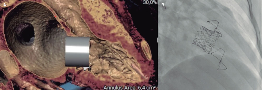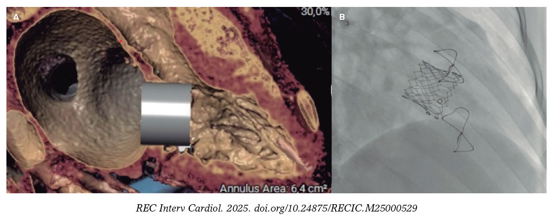 Se optó por un implante percutáneo valve-in-valve. Se realizó estudio con angiografía coronaria por tomografía computarizada con el programa 3Mensio (PIE Medical, Países Bajos), con simulación virtual de prótesis SAPIEN de 29 mm (Edwards Lifesciences, Estados Unidos), considerándose apta, con un área estimada del neotracto de salida del ventrículo izquierdo de 1,8 cm2 (figura 1A).