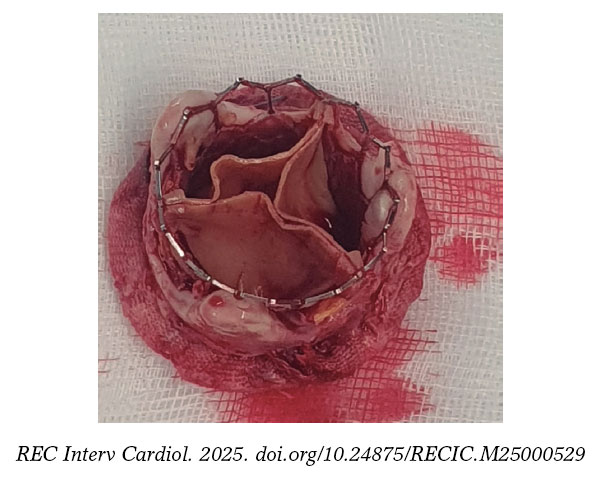 La paciente presentó rachas de taquicardia ventricular monomorfa no documentadas previamente (figura 2). La telemetría sugirió un probable origen en los músculos papilares, confirmado por ecocardiografía transtorácica que mostró contacto sistólico de la prótesis con el músculo papilar posterior (vídeo 5 de material adicional). El Holter evidenció taquicardias ventriculares frecuentes a pesar del tratamiento con bloqueadores beta. Dada la baja probabilidad de éxito con ablación, se decidió explantar la válvula percutánea (figura 3) e implantar una prótesis mecánica mitral ATS n.º 31 (Medical Open Pivot, Estados Unidos).