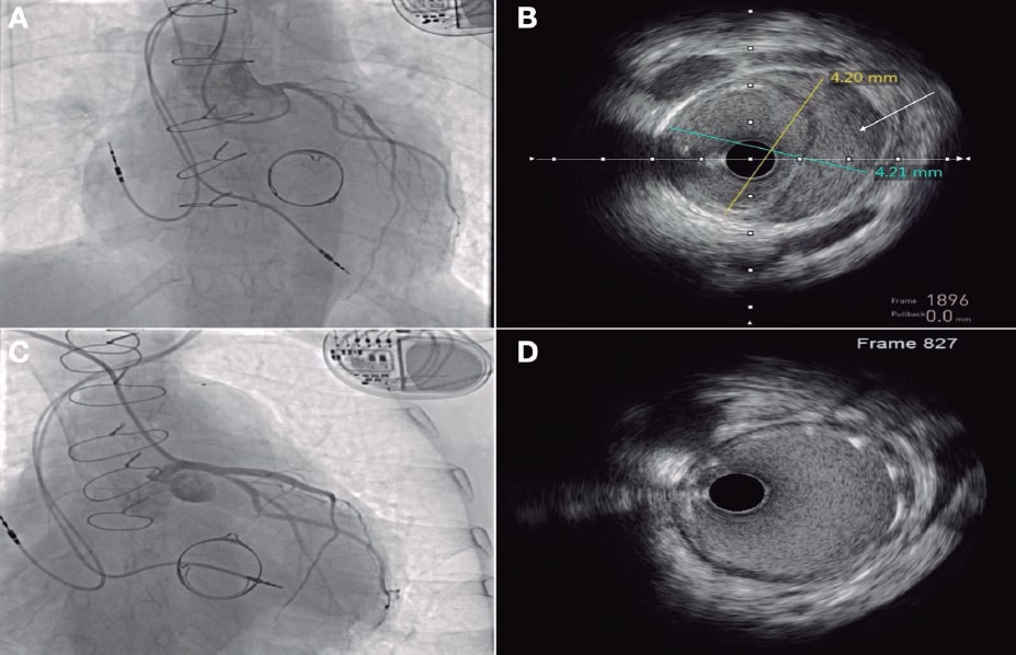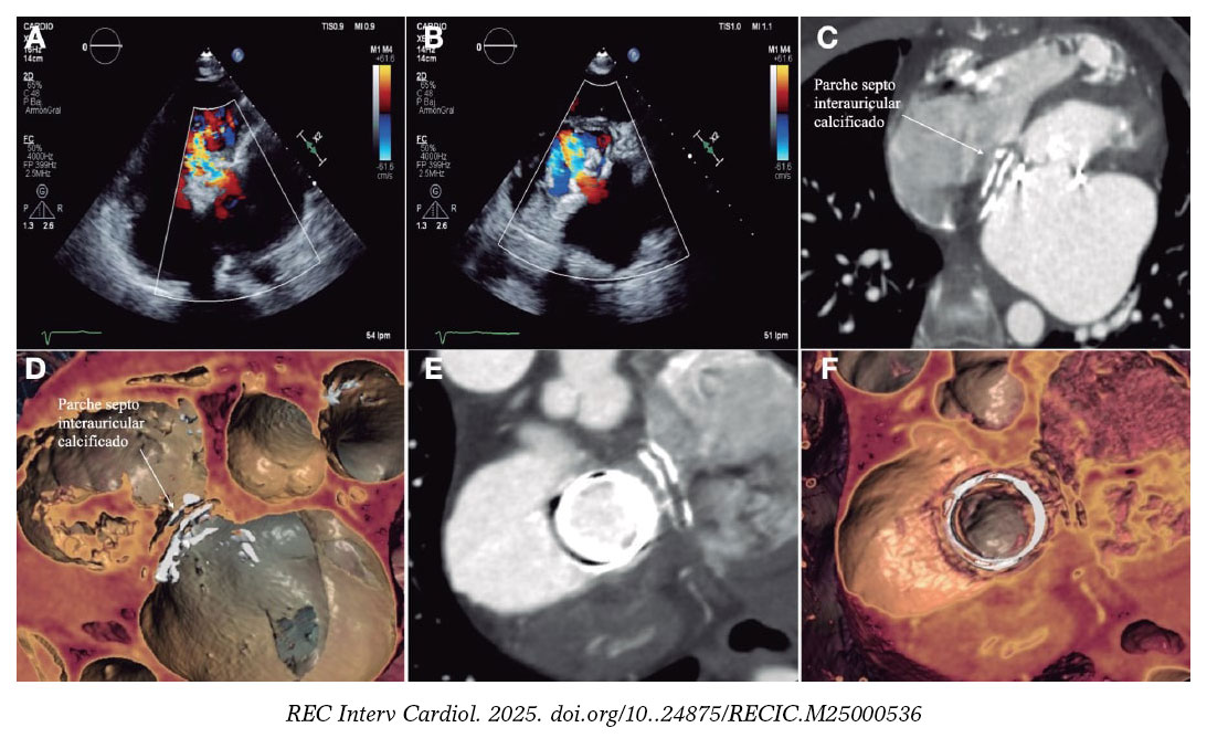 Mujer de 55 años con canal auriculoventricular incompleto con reparación del cleft mitral y cierre con parche del defecto tipo ostium primum y posterior implante de bioprótesis mitral (Carpentier PERIMOUNT 27, Edwards, EE.UU.) en la edad adulta. Evolucionó con episodios de aleteo auricular izquierdo y se decidió realizar una ablación retroaórtica del nódulo auriculoventricular, por imposibilidad de punción transeptal, con disección yatrogénica del tronco común izquierdo resuelta tras el implante de un stent farmacoactivo (figura 1A-D, vídeos 1 y 2 del material adicional). A lo largo del seguimiento presentó datos de degeneración protésica progresiva (figura 2A-B, vídeos 3 y 4 del material adicional), por lo que se decidió llevar a cabo un implante percutáneo de prótesis mitral valve-in-valve. Se procedió con punción transeptal del parche gravemente calcificado (figura 2C-D) con sistema Versacross (Boston Scientific, EE.UU.) y mediante un catéter deflectable se avanzó una guía de alto soporte que fue capturada en el ventrículo izquierdo, estableciendo un circuito venoarterial. Se realizó septostomía con catéter balón Atlas Gold 16 × 45 mm (BD, EE.UU.), y con gran dificultad, dada la complejidad anatómica, se avanzó una vaina de 26 Fr DRYSEAL (Gore, EE.UU.) hasta la aurícula izquierda, a través de la cual se implantó una bioprótesis SAPIEN 3 Ultra 26 (Edwards, EE.UU.) con inflado nominal + 2 cm3. Se observó una buena expansión, con ligera protrusión en el ventrículo izquierdo sin conflicto con el tracto de salida (figura 3A-D, vídeo 5 del material adicional). Se dio el alta hospitalaria a la paciente con una función protésica normal que se mantenía al año de seguimiento (vídeo 6 del material adicional). La paciente firmó el consentimiento informado.