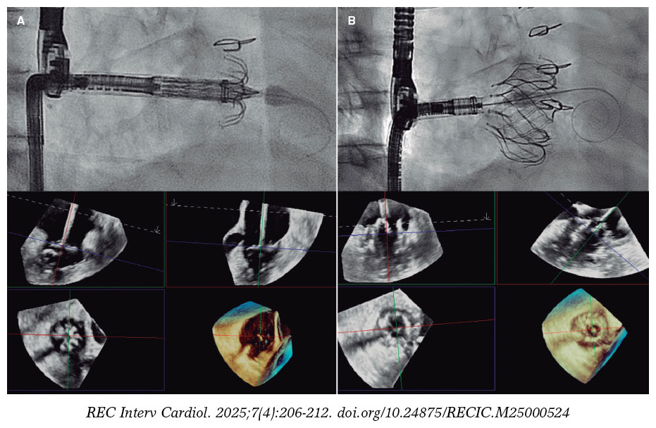 Figura 1. Implante de prótesis EVOQUE (Edwards Lifesciences, EE.UU.). A: se pueden valorar cada anclaje y su posición de captura con el velo mediante ecocardiograma tridimensional. B: resultado final, que es óptimo.