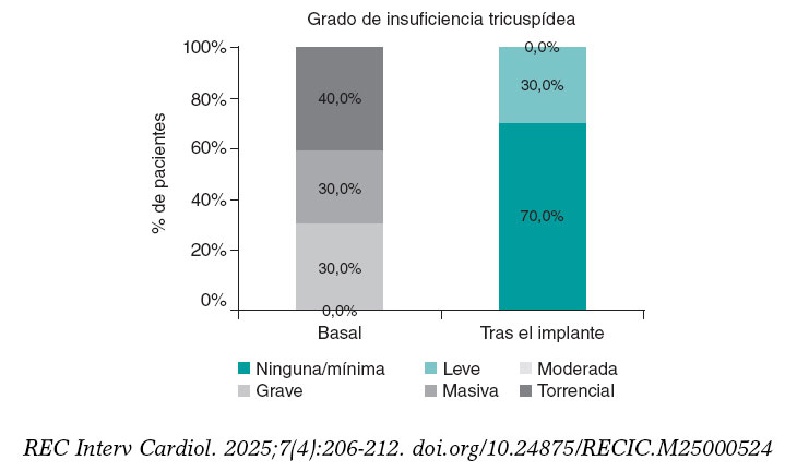 La insuficiencia tricuspídea (IT) grave se asocia con mal pronóstico1. El momento óptimo para la intervención aislada en la válvula tricúspide continúa siendo una incógnita, pero en las fases tardías de la evolución natural de la enfermedad los pacientes ya presentan signos de insuficiencia cardiaca derecha y responden peor al tratamiento diurético2. En estas fases avanzadas, es posible que cualquier intervención sea fútil.
