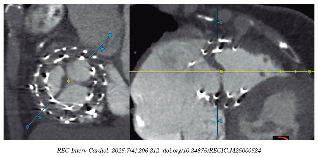 Otro aspecto relevante es el tratamiento antitrombótico tras el implante de la prótesis. En nuestra serie, 1 paciente presentó trombosis de la prótesis EVOQUE en la TC de control al mes del procedimiento; en la ecocardiografía de control previa al alta no se visualizó ningún trombo y el gradiente transprotésico era normal (2 mmHg). Esta paciente fue dada de alta con rivaroxabán 20 mg, que ya tomaba previamente. La otra paciente que presentó trombosis de la prótesis estaba en tratamiento con acenocumarol por ser portadora de una prótesis metálica, con INR (International Normalized Ratio) en rango entre 2,5 y 3,5. En ambos casos, el tratamiento fue anticoagulación con heparina de bajo peso molecular. En el primer caso, en la ecocardiografía transesofágica realizada 1 semana después persistía la trombosis; el segundo caso tiene pendiente la ecocardiografía de control. Es interesante señalar que en el estudio TRISCEND II13 se recomendaba anticoagulación con warfarina (INR 2,5-3,5) u otro anticoagulante, y antiagregación con ácido acetilsalicílico durante 6 meses. En nuestro centro, el protocolo requiere mantener únicamente la anticoagulación que tomaba previamente el paciente (todos ellos tenían indicación de anticoagulación crónica), sin antiagregación. En el único paciente sin anticoagulación basal se realizó tratamiento con ácido acetilsalicílico. Por otro lado, los 2 casos de trombosis de prótesis en nuestro centro se diagnosticaron por TC, que no se realizaba según el protocolo del estudio TRISCEND II13, por lo que no se puede descartar que pasara inadvertida alguna trombosis subclínica. Si esto tiene relevancia en el seguimiento, en términos de una degeneración protésica precoz, es algo que tendrá que estudiarse en el futuro. Se considera que es necesario realizar una TC en estos pacientes con tratamientos percutáneos novedosos para valorar anatómicamente el resultado con mayor exactitud, así como para descartar complicaciones que puedan pasar desapercibidas con otras técnicas de imagen.