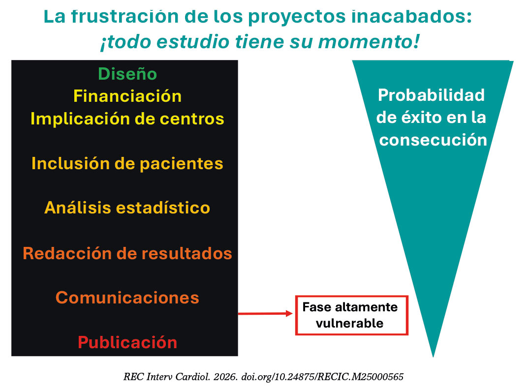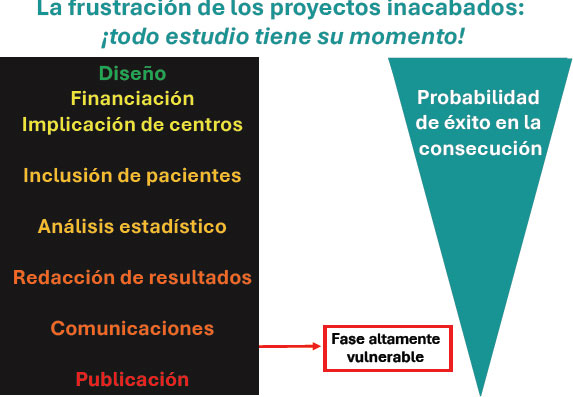 La parte más dura de la investigación deriva de un esfuerzo personal muy grande, junto con una financiación que suele ser muy compleja de lograr o directamente escasa o inexistente. A ello se suman colaboraciones con frecuencia altruistas o poco remuneradas, una monitorización central de datos limitada o nula, un análisis estadístico de calidad variable y una capacidad de publicación reducida, lo que a menudo se traduce en una frustrante cadena de rechazos editoriales (figura 1).
