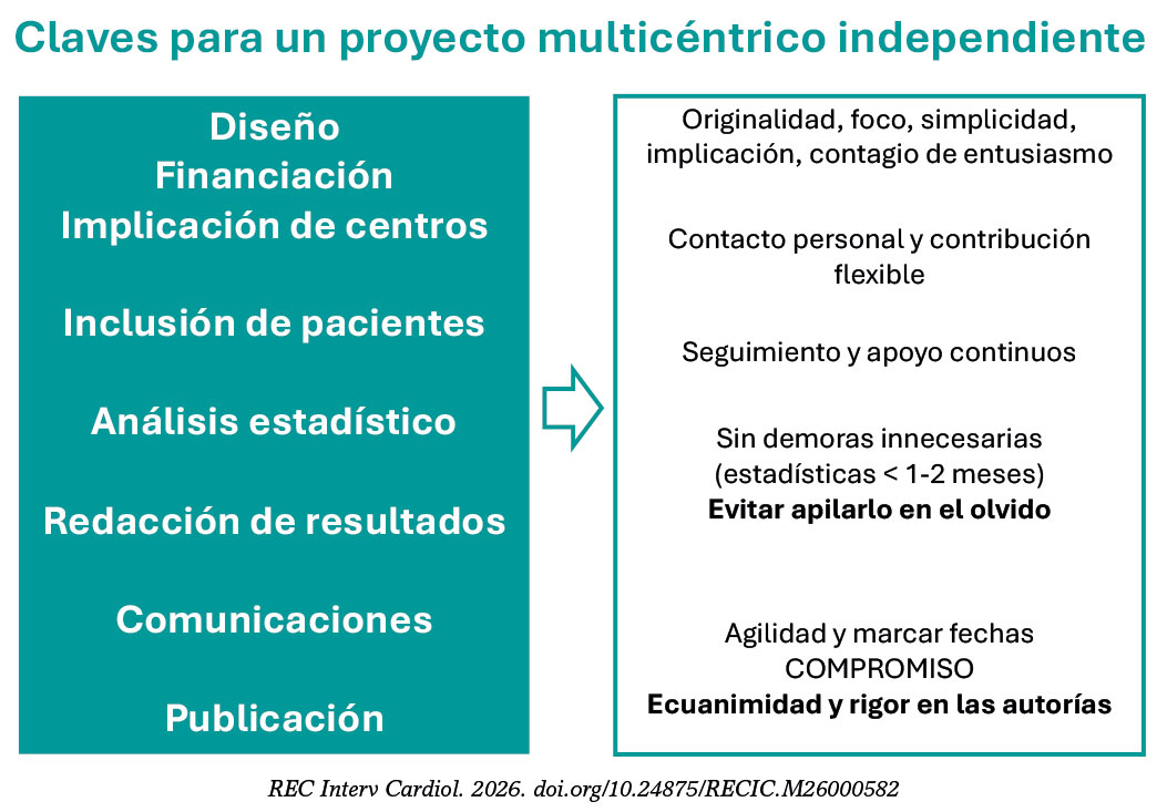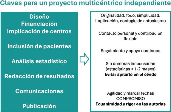 Para acometer con éxito un proyecto de investigación clínica es fundamental definir un objetivo claro, original y con implicación práctica, así como diseñar un proyecto sencillo que altere lo mínimo posible la práctica habitual. Resulta clave solicitar solo la información precisa y esencial, promover una contribución flexible e individualizada de cada centro —priorizando la calidad del dato sobre la cantidad—, mantener un contacto cercano que ofrezca apoyo y complicidad durante la inclusión y el seguimiento, asumir un compromiso real con la difusión y la publicación de los resultados, y establecer autorías amplias, ordenadas por contribución, evitando cualquier tipo de favoritismo (figura 2).