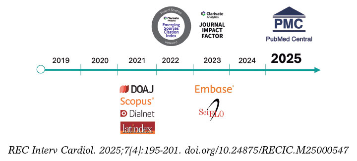 Pues bien, como nuestros lectores ya saben, en este año 2025 REC: Interventional Cardiology ha logrado su inclusión en PubMed Central, gracias a lo cual se puede acceder desde este repositorio al texto completo de todos artículos de la revista desde 2024 (figura 1). Conseguir que la fase final de evaluación tuviera un resultado positivo ha precisado un intenso trabajo por parte de la oficina editorial y del equipo editorial. Sin embargo, sin duda alguna, han sido los autores de nuestros contenidos quienes han permitido este logro, así como los evaluadores que han ayudado a mejorar los trabajos recibidos. También tenemos mucho que agradecer a las sucesivas juntas directivas de la Asociación de Cardiología Intervencionista de la Sociedad Española de Cardiología (ACI-SEC) de los últimos 8 años, que nos han brindado independencia y apoyo incondicional, y a las entidades que generosamente financian este gran proyecto de todos. Y por supuesto, esto no sería posible sin estar dentro de la familia de publicaciones científicas REC Publications, sostenida y amparada por la SEC.