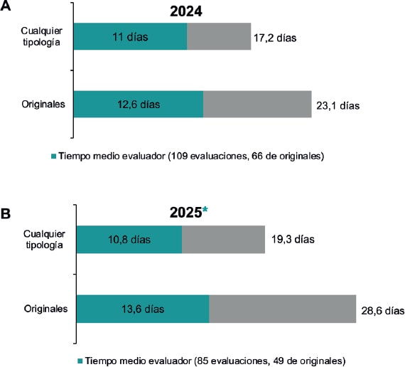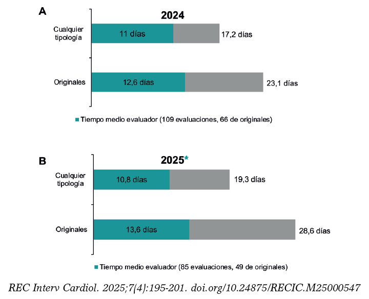 Figura 10. Promedio del tiempo de valoración en 2024 (A) y en el primer semestre de 2025 (B), general y para artículos originales.