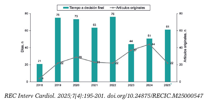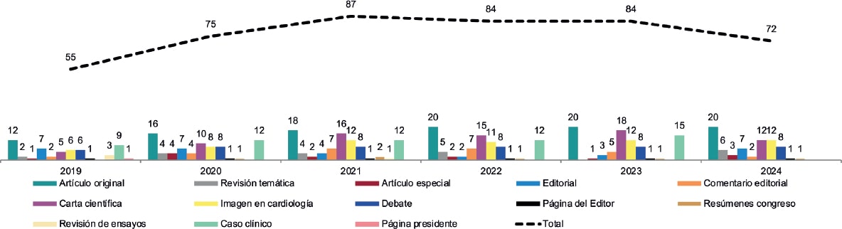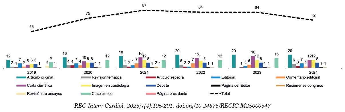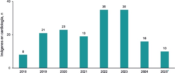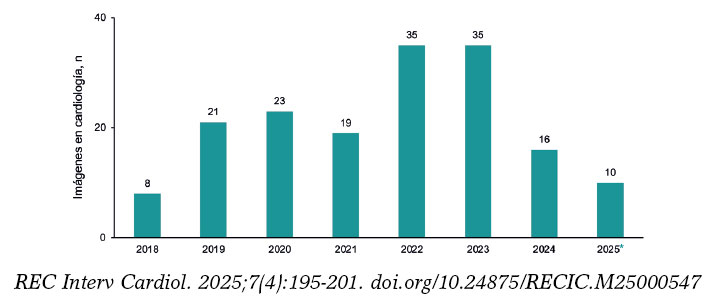 La cardiología intervencionista es una especialidad basada en la imagen y, por ello, este tipo de contenido tiene una gran popularidad. De hecho, el excesivo volumen de imágenes a la espera de inclusión en un número nos motivó a suspender la recepción por unos meses del periodo 2023-2024, y reactivarla en junio de 2024 (figura 7). Dada la enorme cantidad de casos que ofrecen imágenes interesantes y la relativa facilidad en la preparación de este tipo de manuscritos, solo una reducida fracción de ellos se acepta para publicación por limitaciones de espacio editorial.