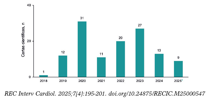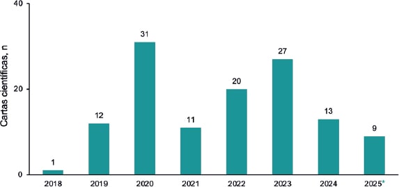 Las cartas científicas equivalen realmente a estudios originales presentados en un formato menos extenso o a cortas series de casos clínicos con particular interés. En la figura 6 se aprecia que el año 2023 fue muy fructífero y que el volumen de recepción se redujo notablemente en 2024. Es preciso señalar que el cambio efectuado hace 2 años en la normativa de la revista, de no admitir para valoración casos aislados en este formato, explica en gran medida la menor recepción. Confiamos en que en 2025 se supere el volumen del año previo. Creemos que este es un formato muy atractivo, también como alternativa para aquellos artículos originales que no tienen suficiente prioridad de publicación como tales pero que son de cierto interés para la revista.