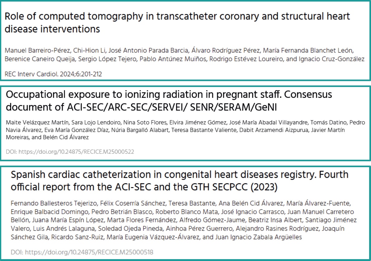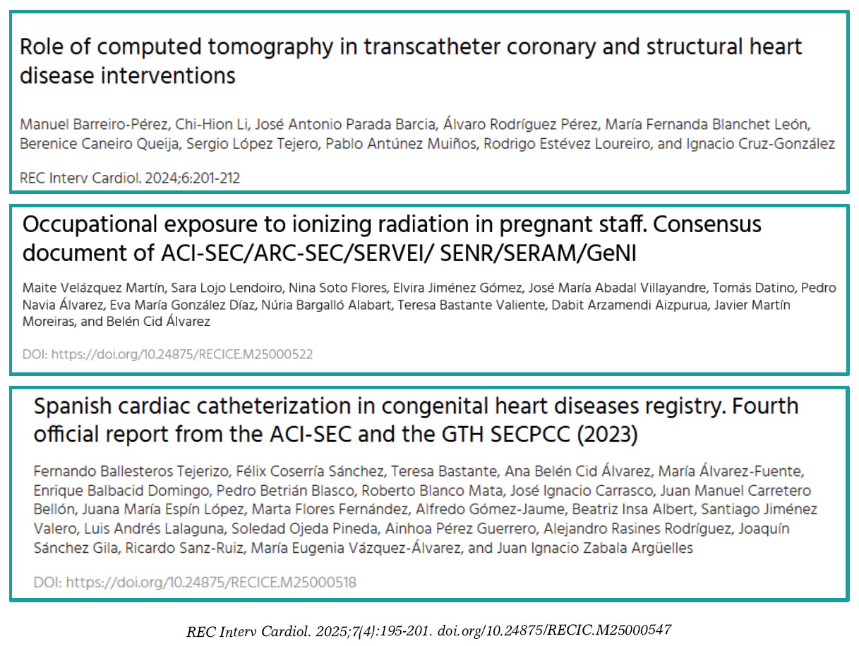 3. Velázquez Martín M, Lojo Lendoiro S, Soto Flores N, et al. Occupational exposure to ionizing radiation in pregnant staff. Consensus document of ACI-SEC/ARC-SEC/SERVEI/SENR/SERAM/GeNI. REC Interv Cardiol. 2025;7:246-254.