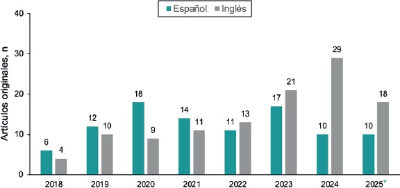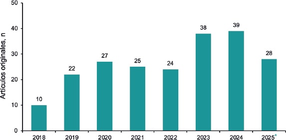 En la figura 3 se ve que el número de artículos originales recibidos ha ido aumentando, con estabilidad en 2023-2024 y una notable tendencia al alza en 2025, en cuyo primer semestre se ha recibido ya el 72% de lo que llegó el año anterior.