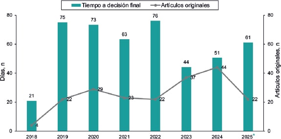 Figura 5. Promedio de días para tomar una decisión final sobre los artículos originales. Las barras corresponden al tiempo medio en tomar decisión. La línea gris indica el volumen de artículos sobre los que se ha tomado una decisión en cada año.