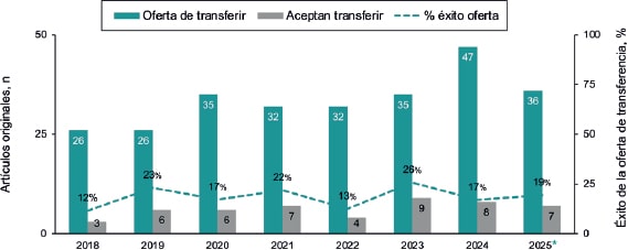 No obstante, la oferta de transferencia de una revista de mayor impacto a otra de impacto menor siempre existe la posiblidad de que los autores no la acepten, como refleja el volumen de artículos que finalmente se transfieren (figura 8). Tenemos la convicción de que la presencia en PubMed Central y la consolidación del factor de impacto irán haciendo más atractiva esta opción para los autores.