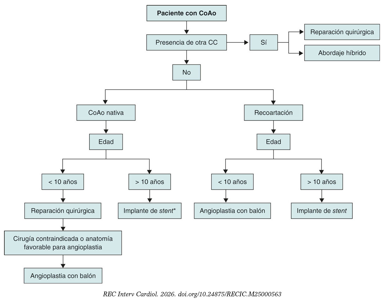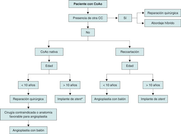 En adolescentes y adultos, si la anatomía es favorable y en ausencia de una CC asociada que precise reparación quirúrgica, el implante de stent percutáneo se considera, en la actualidad, el tratamiento de primera línea25. Estas consideraciones dependerán de las características anatómicas de cada paciente. La experiencia de cada centro con estos casos también influye en la toma de decisiones clínicas.